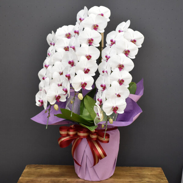 商品説明 白い花弁に赤いリップの紅白大輪胡蝶蘭。 価格:30,800円(税込) 全体サイズ 高さ:約90cm幅 :約50cm 一輪サイズ 幅 :約12cm 輪数 45輪以上(蕾含む) 種別 大輪鉢花 用途 ビジネス・お祝い 商品のご購入 一覧に戻る