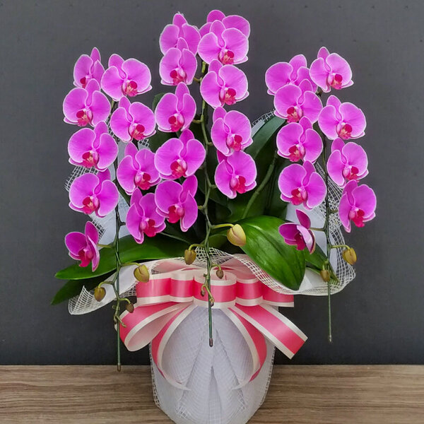 商品説明 濃いピンクの花弁が華やかで美しいミディ胡蝶蘭です。 価格:16,500円(税込) 全体サイズ 高さ:約60cm幅 :約35cm 一輪サイズ 幅 :約7.5cm 種別 ミディ鉢花 用途 お祝い 商品のご購入 一覧に戻る